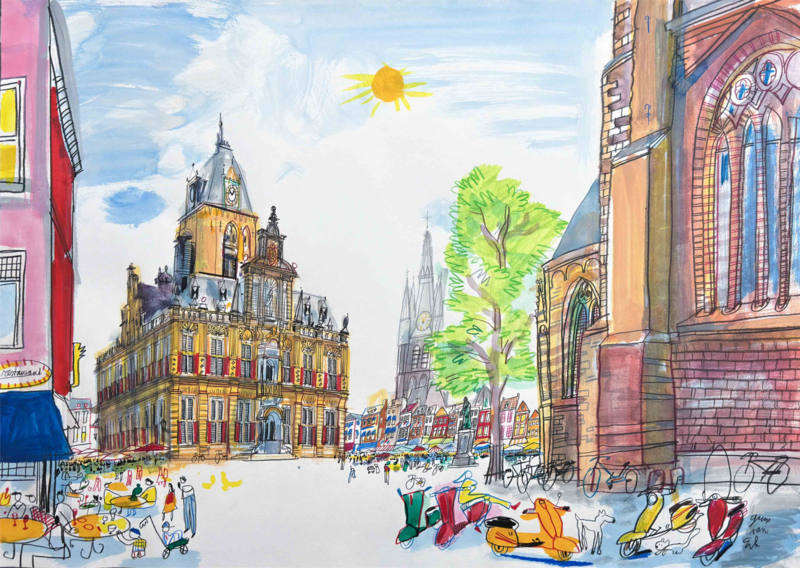 Delft - Markt met het Stadhuis en een hoek Nieuwe Kerk